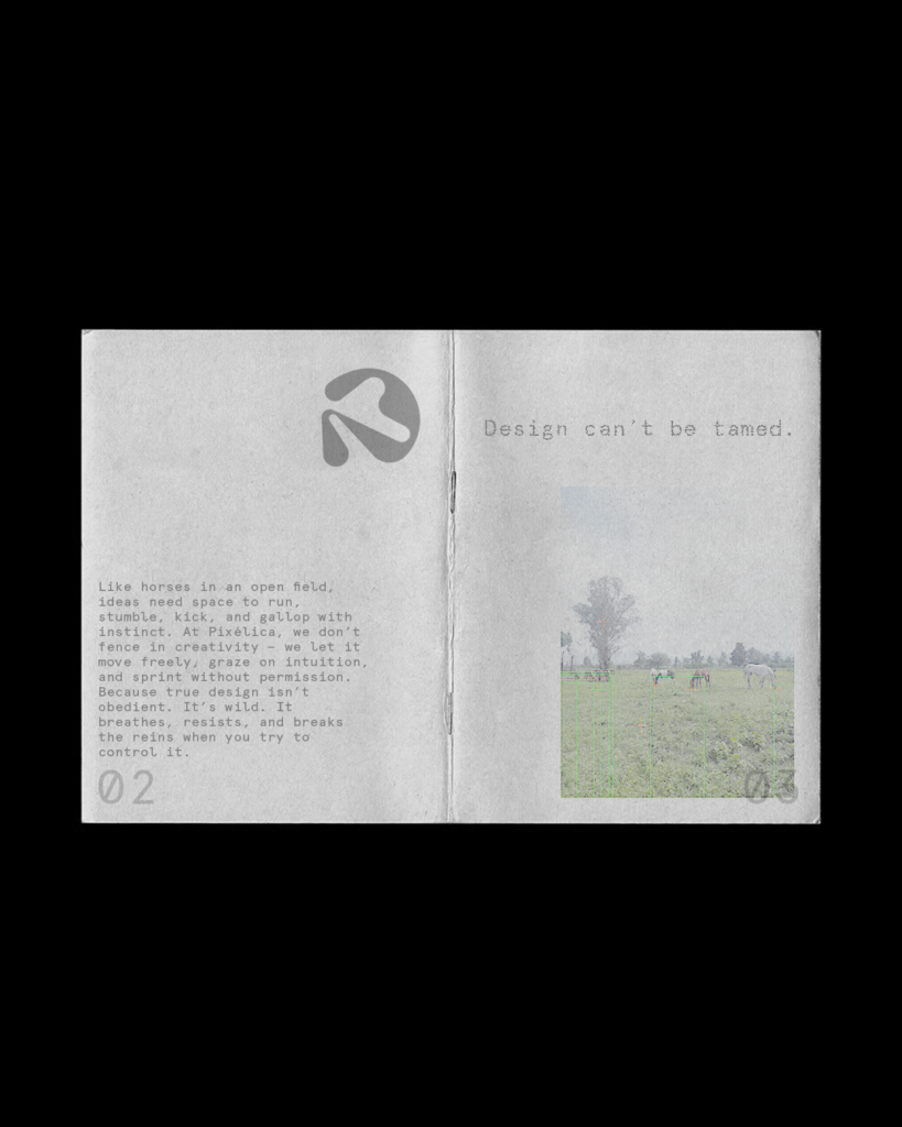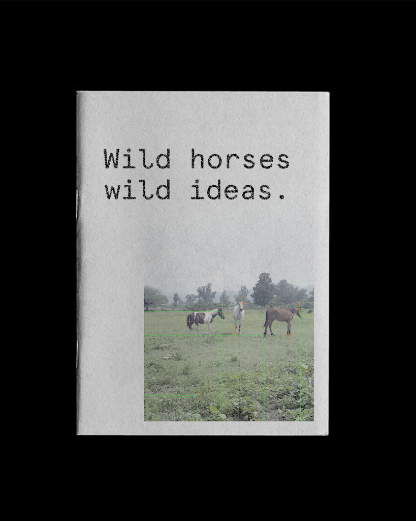 Este proyecto editorial parte de la metáfora del caballo salvaje como símbolo de creatividad libre e indomable. La propuesta explora cómo las ideas necesitan espacio para fluir y transformarse sin restricciones. A nivel visual, se trabajó con un estilo crudo y minimalista, evocando la estética de un fanzine contemporáneo. El uso de tipografía mecanográfica y papel desgastado refuerza la sensación de espontaneidad. El resultado es una pieza que transmite la fuerza de un diseño que no puede ser domesticado.