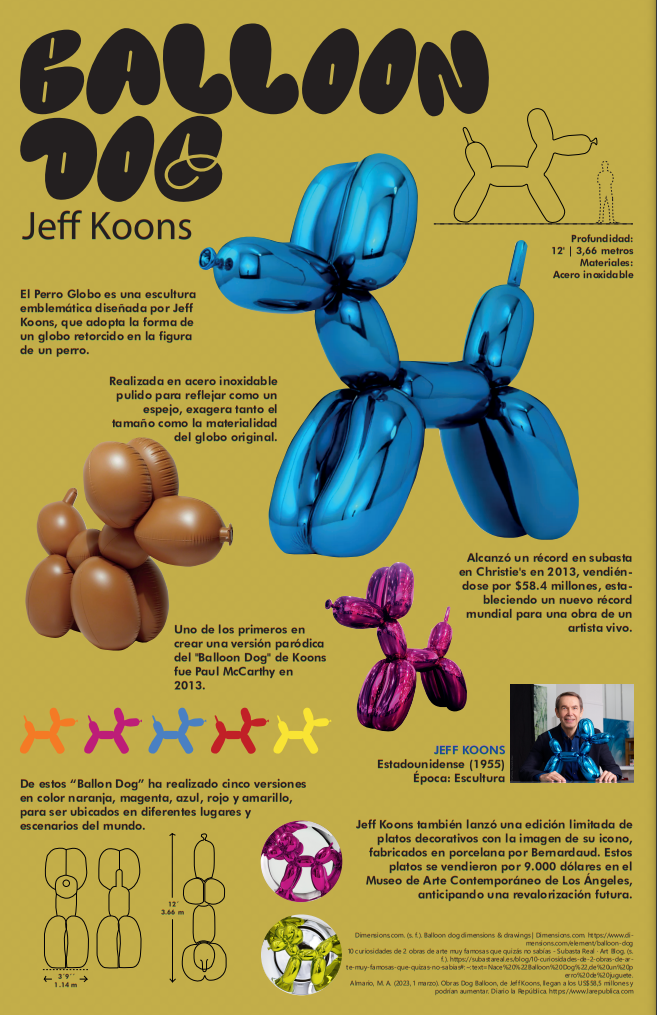 Este proyecto consistió en el desarrollo de una infografía editorial sobre la obra icónica de Jeff Koons, el “Balloon Dog”, analizando su valor artístico y cultural. La propuesta integra tipografía expresiva, ilustraciones esquemáticas y recursos visuales que explican tanto el proceso como el impacto de la escultura. El diseño busca equilibrar la claridad informativa con una estética lúdica y contemporánea, en sintonía con la naturaleza de la pieza. El resultado es una infografía que combina divulgación cultural con un lenguaje visual atractivo y didáctico.