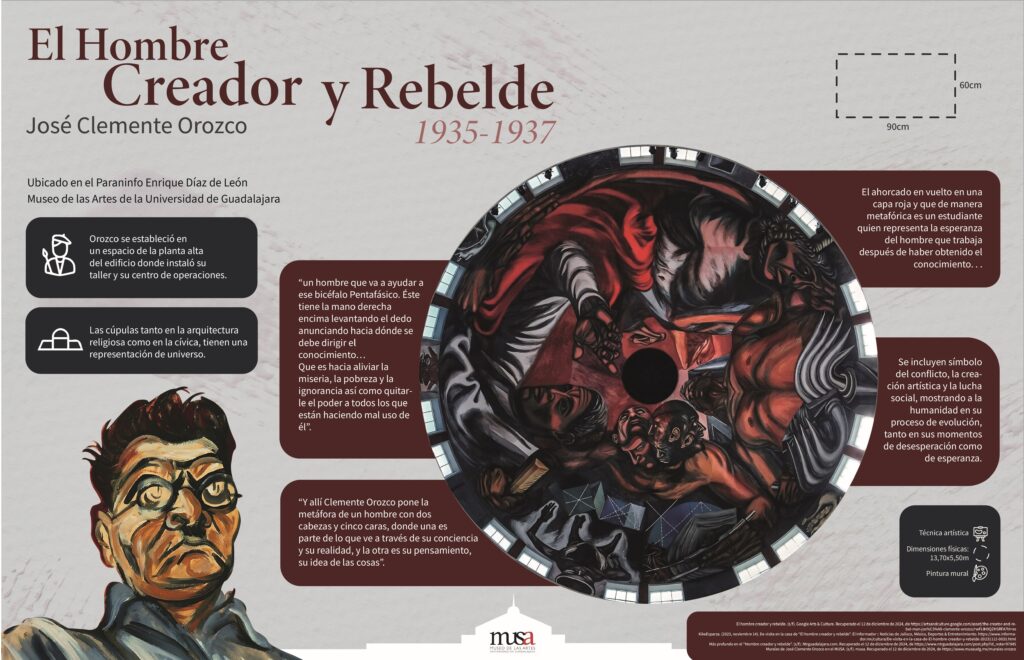 Este proyecto consistió en el diseño de una infografía cultural sobre el mural El Hombre Creador y Rebelde (1935–1937) de José Clemente Orozco, ubicado en el Paraninfo Enrique Díaz de León. La propuesta organiza información histórica, simbólica y visual del mural, integrando ilustraciones, diagramas y citas que contextualizan la obra. Es una pieza divulgativa que acerca al público al valor artístico y social del muralismo mexicano.