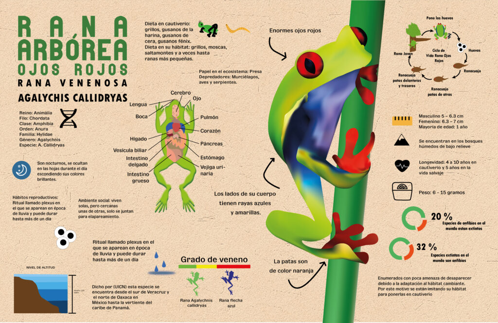 Este proyecto fue desarrollado como un trabajo colaborativo en la universidad, enfocado en la divulgación científica y el diseño editorial. La infografía presenta información biológica y ecológica sobre la rana arbórea de ojos rojos, integrando esquemas, gráficos y recursos visuales. Mi participación se centró en la ilustración digital con degradados de la especie y en el acomodo visual de la información, asegurando claridad y coherencia en la composición. El resultado es una pieza didáctica y atractiva que comunica de manera accesible los aspectos más relevantes de esta especie.