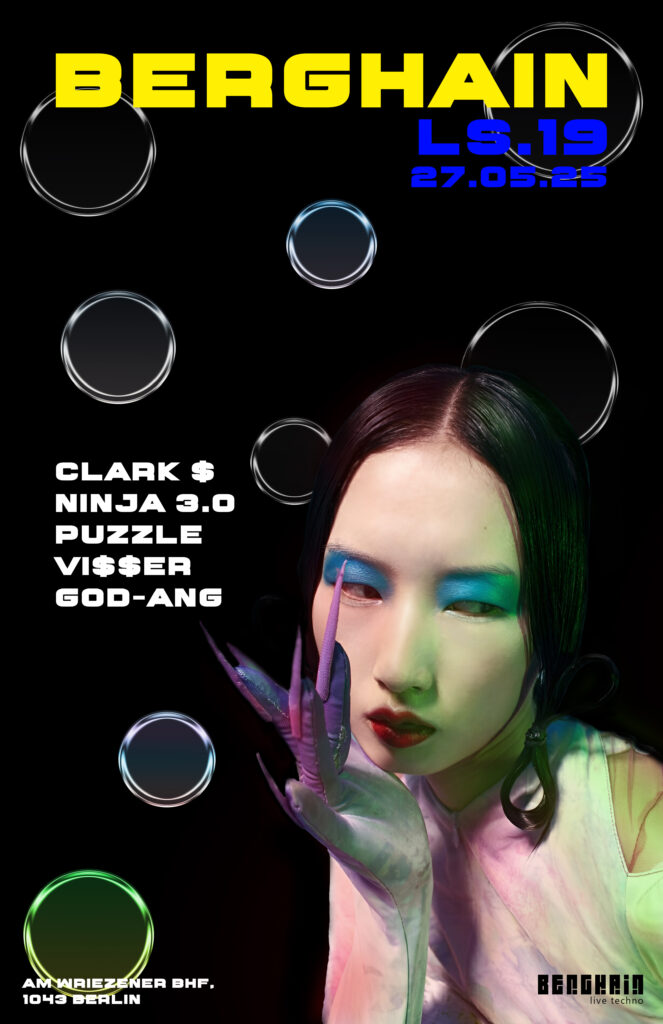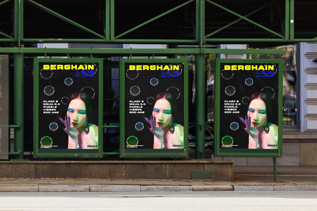 Este proyecto gráfico toma como referencia la estética futurista y experimental de la escena techno de Berlín. El diseño utiliza contrastes cromáticos intensos y una composición minimalista que refuerza la atmósfera enigmática del club Berghain. La imagen central, intervenida digitalmente en Photoshop, transmite una sensación de alteridad y artificialidad, coherente con la cultura electrónica. El resultado es un cartel de fuerte impacto visual que funciona tanto en formato individual como en su aplicación urbana.