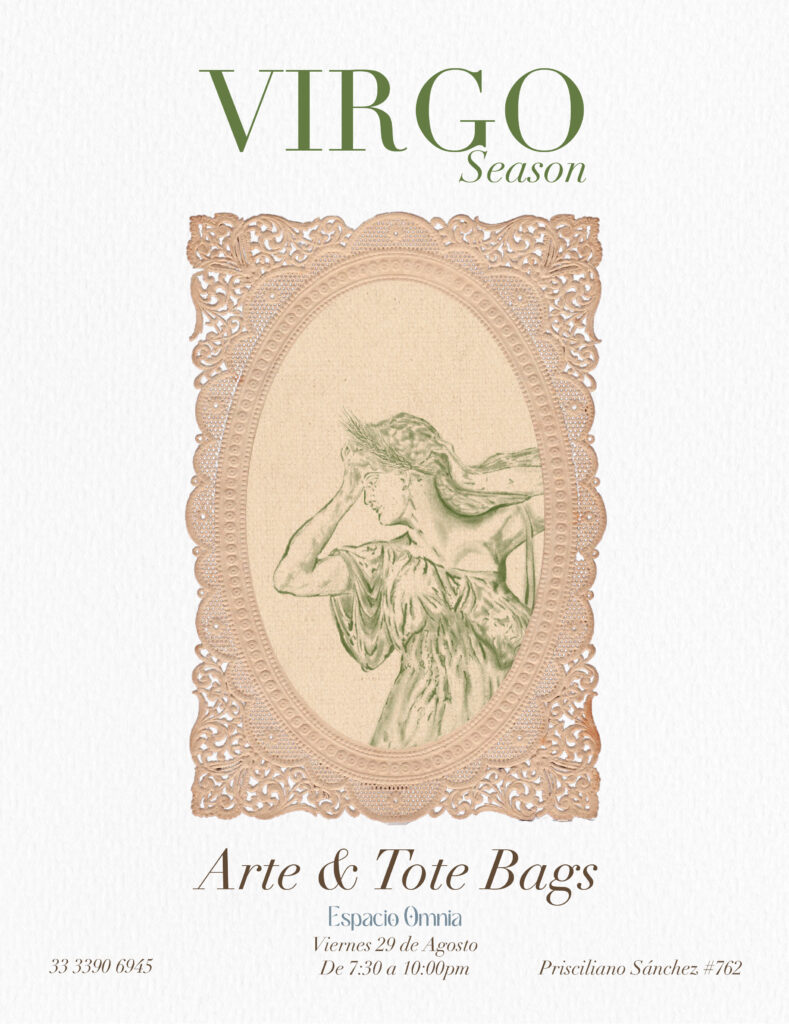 Este cartel fue diseñado para un evento cultural en Espacio Omnia, tomando como inspiración la simbología del signo Virgo. La propuesta gráfica utiliza una paleta sobria y natural, reforzando la conexión con la estética clásica y espiritual del tema. El marco ornamental y la ilustración central evocan delicadeza, equilibrio y un sentido de lo artesanal. El resultado es una pieza elegante y atemporal que comunica tanto la identidad del evento como su carácter artístico.